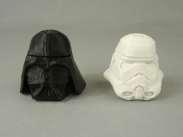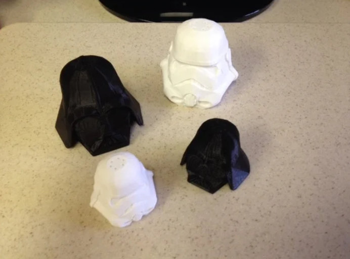Представляем Вам набор для вечеринки по "Звездным войнам" - солонку и перечницу. На дне есть выступы, которые входят в прорези наверху, а крышка сдвигается в сторону, чтобы закрыть (см. Рисунки). Низ печать без поддержки. Вершинам нужна небольшая поддержка в центре.